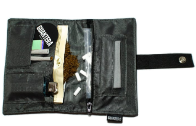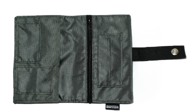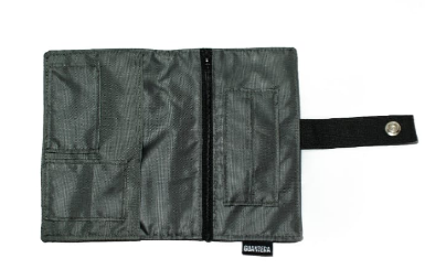 cuenta con dos bolsillos grandes (uno con cierre) y dos besillos pequeños. Ademas cuenta con cierre de broche.